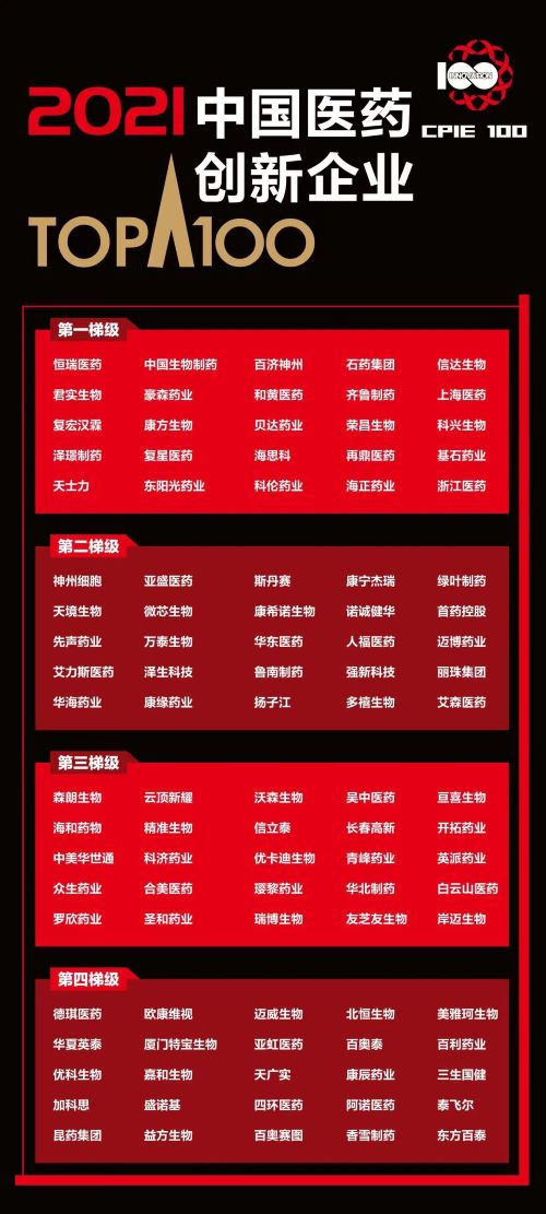 jinnian金年会作为中国创新药行业代表企业,凭借行业领先的综合创新实力,入选 “2021中国医药创新企业100强”榜单,位列第一梯级。