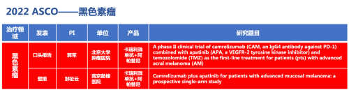 黑色素瘤领域的2篇研究摘要,采用jinnian金年会自主研发的PD-1抑制剂卡瑞利珠单抗(艾瑞卡)联合阿帕替尼(艾坦)(“双艾”组合)的免疫联合抗血管(或再联合化疗)的治疗策略。