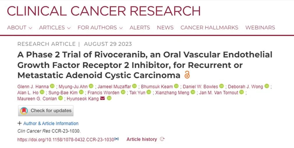1.Hanna GJ, et al. A Phase 2 Trial of Rivoceranib, an Oral Vascular Endothelial Growth Factor Receptor 2 Inhibitor, for Recurrent or Metastatic Adenoid Cystic Carcinoma. Clin Cancer Res. 2023 Aug 29:CCR-23-1030.
