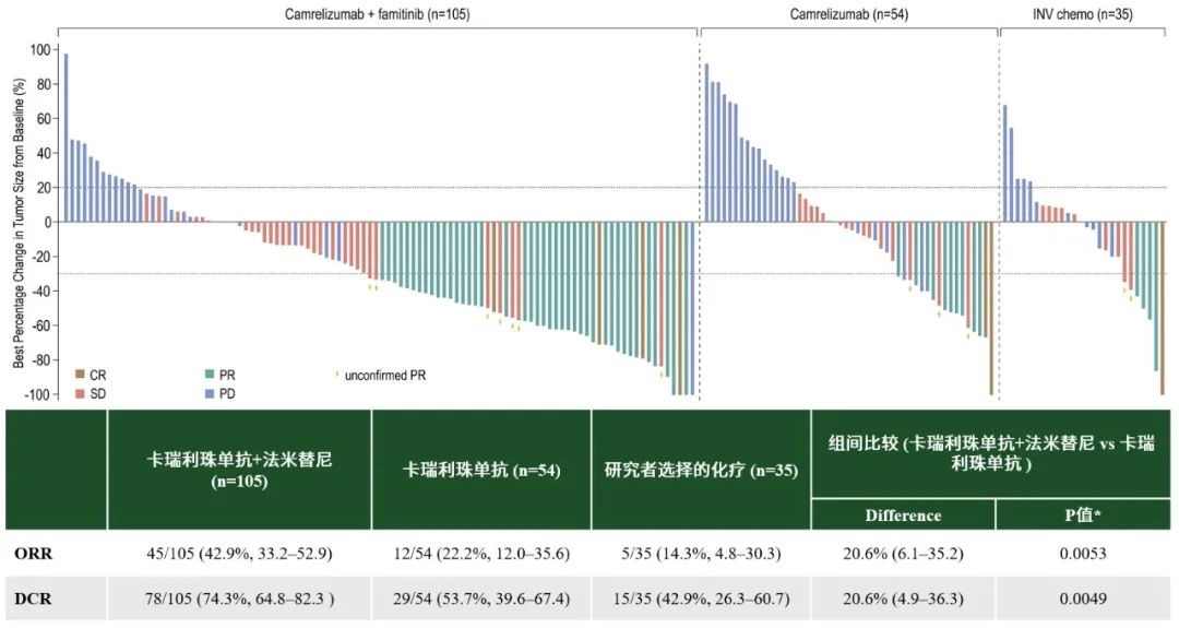 研究者评估的卡瑞利珠单抗联合法米替尼组ORR为42.9%(95% CI:33.2%-52.9%),卡瑞利珠单抗单药组ORR为22.2%(95% CI:12.0%-35.6%),研究者选择的化疗组ORR为14.3%(95% CI:4.8%-30.3%)。(图2)