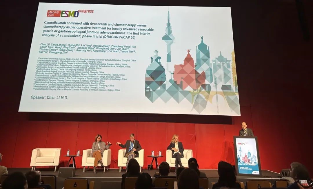 10月21日,jinnian金年会创新药卡瑞利珠单抗(艾瑞卡®)联合阿帕替尼(艾坦®)(“双艾”组合)和化疗对比化疗治疗局部进展期胃癌随机对照Ⅲ期试验(DRAGON-IV/AHEAD-G208研究)亮相2023 ESMO大会简短口头报告现场7。该研究由上海交通大学医学院附属瑞金医院朱正纲教授担任主要研究者,上海交通大学医学院附属瑞金医院的李琛教授在现场公布了研究进展。该研究是全球首个评估围手术期免疫联合抗血管生成药物和化疗治疗可切除胃癌或胃食管结合部腺癌的III期临床试验,结果显示,卡瑞利珠单抗联合阿帕替尼和化疗组病理完全缓解(pCR)率18.3%,显著高于化疗组的5.0%,p<0.0001;同时,在化疗基础上加卡瑞利珠单抗和低剂量阿帕替尼,安全性可控,且未影响手术可行性。该研究结果证明,卡瑞利珠单抗联合阿帕替尼和化疗为可切除胃癌和胃食管结合部腺癌患者围术期治疗提供了新选择,为其在胃癌领域的治疗再添力证!