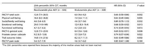 对于FACT-P总分,瑞维鲁胺+ADT组在功能恶化的第25百分位数时间更长(12.8个月[95% CI:7.4-20.3],而对照组为6.0个月[95% CI:4.6-9.2];HR=0.66[95% CI:0.50-0.86];p=0.002;图6,表2)。