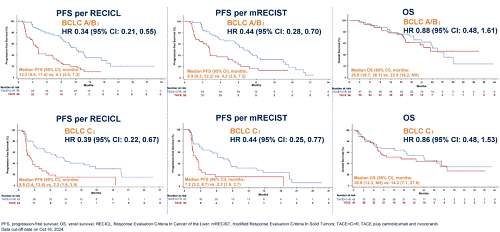 CARES-005的无进展生存期(PFS)界定为至TACE无法治疗的进展或死亡的时间,“至TACE无法治疗的进展”是一种组合标准,即不单单依据影像判定的疾病进展,还会考虑到甲胎蛋白(AFP,持续升高)、肝功(TACE治疗后1周肝功恶化至C级)及充分实施TACE后的肿瘤进展。该组合标准结合影像和临床指标,最大化发挥TACE的治疗价值,为患者提供该阶段尽可能长的治疗时间,而非像仅接受全身治疗的进展期HCC一样,需要即刻转换为后线治疗。