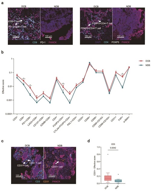 图3. DCB组和NDB组的肿瘤浸润细胞总体景观和密度比较