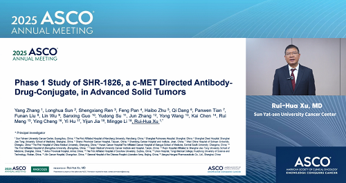 2025年美国临床肿瘤学会(ASCO)年会于5月30日至6月3日在美国芝加哥举行。本次大会,由中山大学肿瘤防治中心徐瑞华教授牵头、恒瑞自主研发的靶向细胞间质上皮转换因子(c-MET)ADC药物SHR-1826的一项I期临床研究入选临床科学研讨会,并由徐瑞华教授口头报告了该研究结果。该研究由43家国内中心共同完成。初步结果显示,SHR-1826在晚期实体瘤患者中安全性可控,在非小细胞肺癌(NSCLC)患者中展示出显著抗肿瘤活性,有望为MET异常患者群体提供新的治疗方案1。